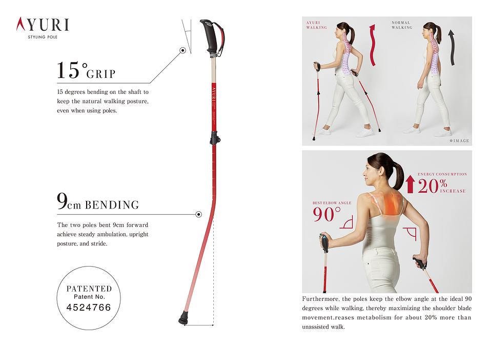 A completely new walking poles conceived from rehabilitation expertise and knowhow. The patented unique structure supports correct walking posture. The active movement of the shoulder blades increases metabolism in the back area, improving exercise efficiency and helping to tone your figure.