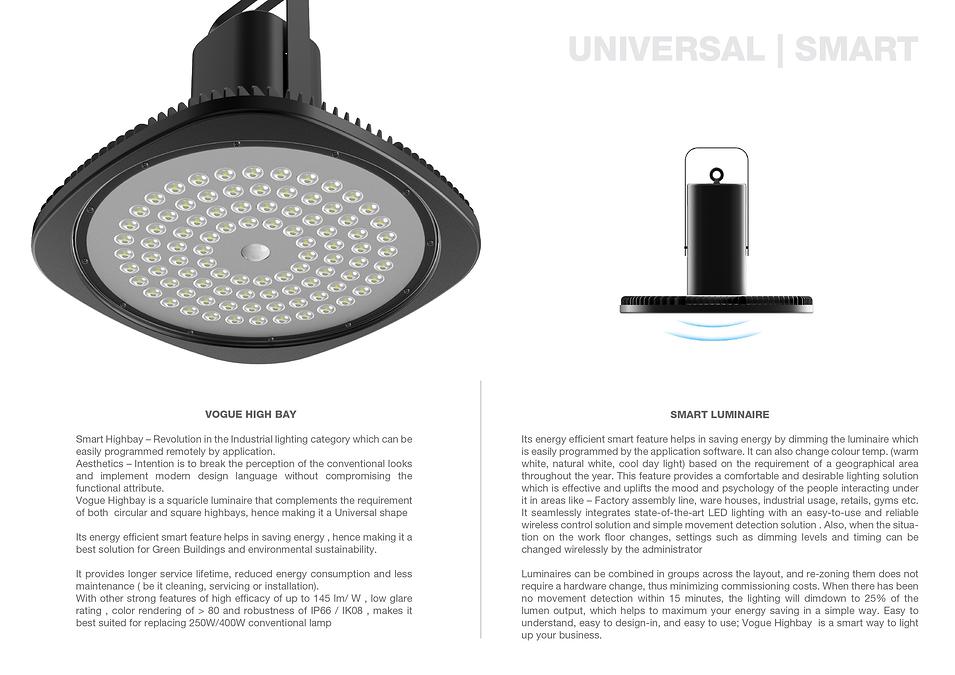 Smart Highbay – Revolution in the Industrial lighting category which can be easily programmed remotely by application. Aesthetics – Intention is to break the perception of the conventional looks and implement modern design language without compromising the functional attribute. Its energy efficient smart feature helps in saving energy , hence making it a best solution for Green Buildings and environmental sustainability. It provides longer service lifetime, reduced energy consumption and less maintenance ( be it cleaning, servicing or installation). With other strong features of high efficacy of up to 145 lm/ W , low glare rating , color rendering of > 80 and robustness of IP66 / IK08 , makes it best suited for replacing 250W/400W conventional lamp.