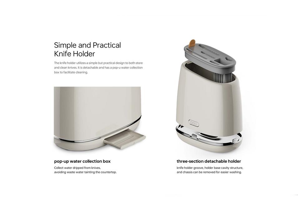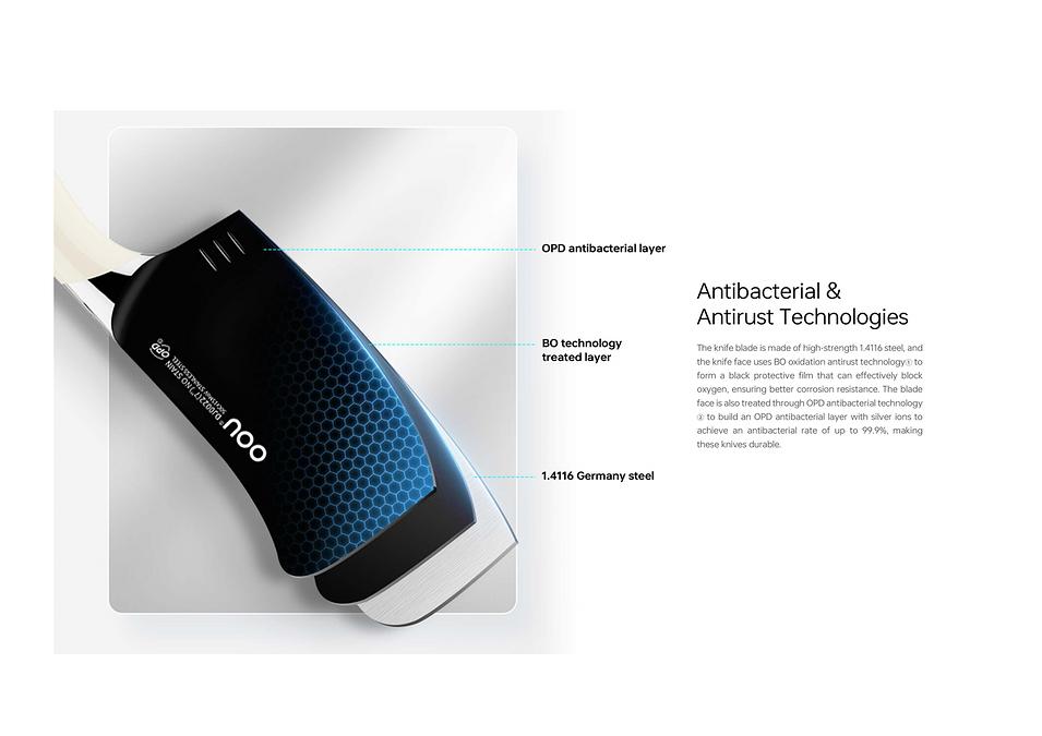 This set of multi-functional knives is tailored for kitchen scenes in the post-pandemic era, meeting all cutting needs when preparing ingredients. The blade surface of the knives adopts the pioneering OPD antibacterial technology and BO oxidation antirust technology. With stainless steel core material and 15 ° V-shaped edging technology, this set has excellent antibacterial/antirust performance, durability, and sharpness. The detachable knife holder facilitates storing and cleaning these knives.